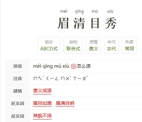 OCR:IMG:mei qing mu xiu 眉清目秀组合结构感情年代热度ABCD式联合式褒义古代常用拼音meiqingmu xiu怎么读注音n'-LnXT-叉感情褒义成语近义词眉目如画眉清目朗反义词其貌不扬
