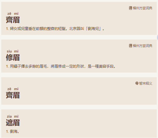 OCR:IMG:福州方言词典zemi 齐眉1.妇女或儿童垂在前额的整齐的短发。北京语叫「刘海儿」。福州方言词典siumi 修眉1.用子择去多余的眉毛,将眉修成一定的形状,是一种美容手段。暂未释义zemi 齐眉ziami 遮眉1.刘海。