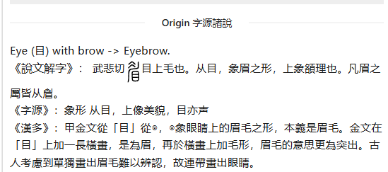 OCR:IMG:Origin字源诸说Eye(目)withbrow-Eyebrow.《说文解字》:武悲切目上毛也。从目,象眉之形,上象理也。凡眉之属皆从眉。《字源》:象形从目,上像美貌,目亦声《汉多》:甲金文从「目」从,象眼睛上的眉毛之形,本义是眉毛。金文在「目」上加一长横画,是为眉,再于横画上加毛形,眉毛的意思更为突出。古人考虑到单独画出眉毛难以辨认,故连带画出眼睛。
