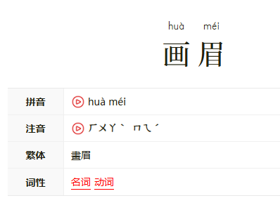 OCR:IMG:hud mei 画眉拼音huamei 注音D 繁体画眉词性名词动词