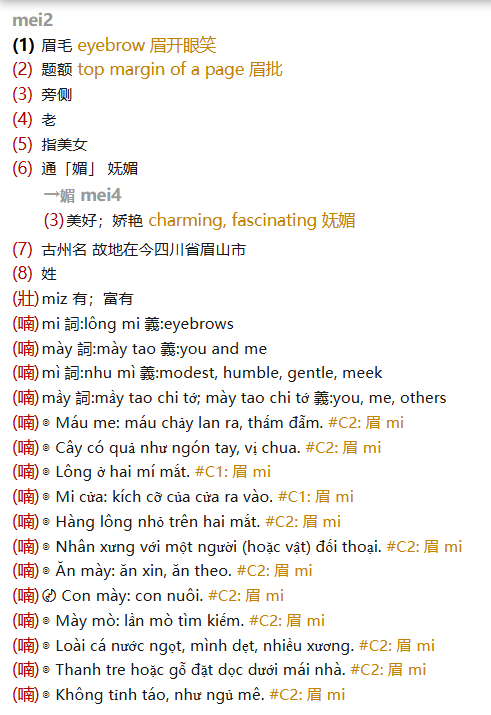 OCR:IMG:mei2(1)眉毛eyebrow眉开眼笑(2)题额topmarginofapage眉批(3)旁侧(4)老(5)指美女(6)通「媚」妩媚一媚mei4(3)美好;娇艳charmingfascinating妩媚(7)古州名故地在今四川省眉山市(8)姓()miz有;富有(喃)mi词:longmi:eyebrows (喃)may词:maytao:you andme (喃)mi词:nhumi:modestumble,gentlem (喃)may词:maytaochito;maytaochitoyoumeothes (喃)Maume:mauchaylanrathamdam.#C2:mi (喃)Caycoquanhungontayvichua.#C2:眉mi (喃)LOnghaimimat.#C1:眉mi (喃)Mi cua:kichcocuacuaravao.#C1:眉mi (喃)Hanglongnhotrenhai mat.#C2:眉mi (喃)Nhanxungvoi motnguoi(hoacvat)doi thoai.#C2:眉mi (喃)Anmay:anxinantheo.#C2:眉mi (喃)Conmay:connuoi.#C2:眉mi (喃)Maymo:lanmotimkiem.#C2:眉mi (喃)Loaicanuocngotminhdet,nhieuxuong.#C2:眉mi (喃)Thanh trehoacgdatdoc duoi mainha.#C2:眉mi (喃)Khongtinhtao,nhungume.#C2:眉mi