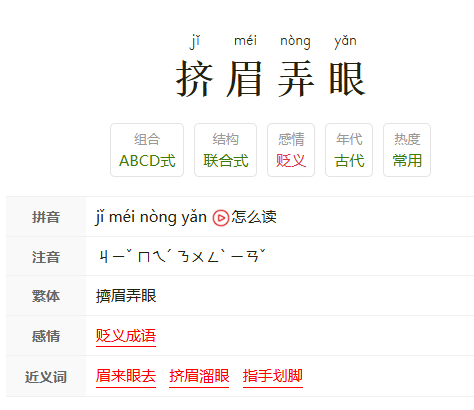 OCR:IMG:jT mei nong yan 挤眉弄眼组合结构感情年代热度ABCD式联合式贬义古代常用拼音jimeinongyan怎么读注音4-11'3X'-3"繁体挤眉弄眼感情贬义成语近义词眉来眼去挤眉溜眼指手划脚