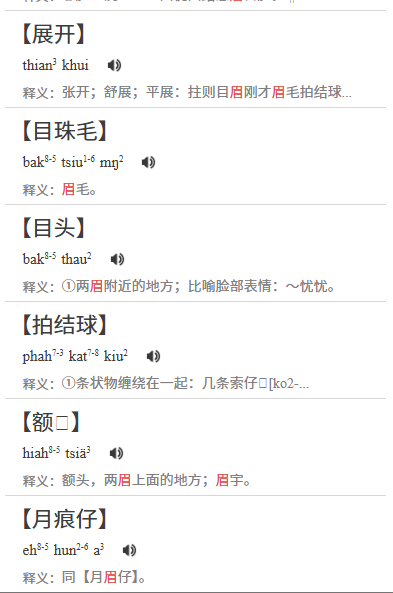 OCR:IMG:【展开】thian'khui 释义:张开;舒展;平展:拄则目眉刚才眉毛拍结球【目珠毛】bak8tsiu1mn2释义:眉毛。【目头】bak$$thau21)释义:两眉附近的地方;比喻脸部表情:忧忧。【拍结球】phahkat-kiu 释义:条状物缠绕在一起:几条索仔口[ko2-【额口】hiahtsia 释义:额头,两眉上面的地方;眉宇。【月痕仔】eh85hun2a》释义:同【月眉仔】。