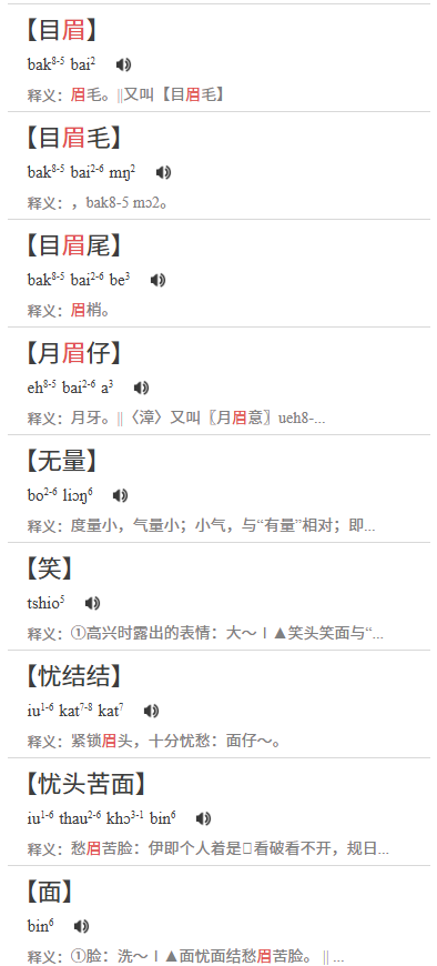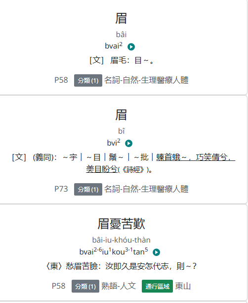 OCR:IMG:眉bai bvai2[文]眉毛:目。P58分类(1)名词-自然-生理医疗人体眉bi bvi2[文](义同):宇|目||批|首蛾,巧笑倩兮美目盼兮(《诗经》)。P73分类(1)名词-自然-生理医疗人体眉忧苦bai-iu-khou-than bvai2-6iu'kou3-1tan5(东)愁眉苦脸:汝即久是安怎代志,则?P58分类(1)熟语-人文通行区域东山