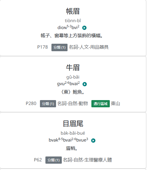 OCR:IMG:帐眉tionn-bi dioN5-3bvi2帐子、窗幕等上方装饰的横幅。P178分类(1)名词-人文-用品器具牛眉gu-bai gvu2-6bvai2《东》鲍鱼。P280分类(1)名词-自然-动物通行区域东山目眉尾bak-bai-bue bvak8-5bvai2-6bvue3眉梢。P62分类(1)名词-自然-生理医疗人体