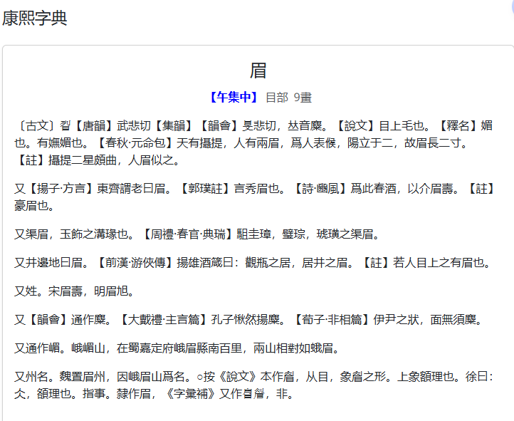 OCR:IMG:康熙字典严【午集中】目部9画【古文】【唐韵】武悲切【集韵】【韵会】悲切,丛音麋。【说文】目上毛也。【释名】媚也。有媚也。【春秋元命包】天有摄提,人有两眉,为人表候,阳立于二,故眉长二寸。【注】摄提二星颇曲,人眉似之。又【扬子·方言】东齐谓老日眉。【郭璞注】言秀眉也。【诗·风】为此春酒,以介眉寿。【注】豪眉也。又渠眉,玉饰之沟也。【周礼·春官·典瑞】圭璋,璧琮,琥璜之渠眉。又井边地日眉。【前汉·游侠传】扬雄酒箴日:观瓶之居,居井之眉。【注】若人目上之有眉也。又姓。宋眉寿,明眉旭。又【韵会】通作麋。【大戴礼·主言篇】孔子楸然扬。【荀子·非相篇】伊尹之状,面无须麋。又通作嵋。峨嵋山,在蜀嘉定府峨眉县南百里,两山相对如蛾眉。又州名。魏置眉州,因峨眉山为名。按《说文》本作,从目,象之形。上象额理也。徐日:交,额理也。指事。隶作眉,《字补》又作自,非。