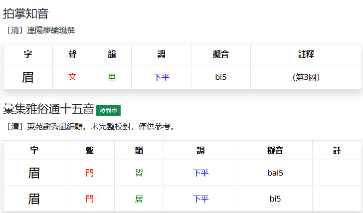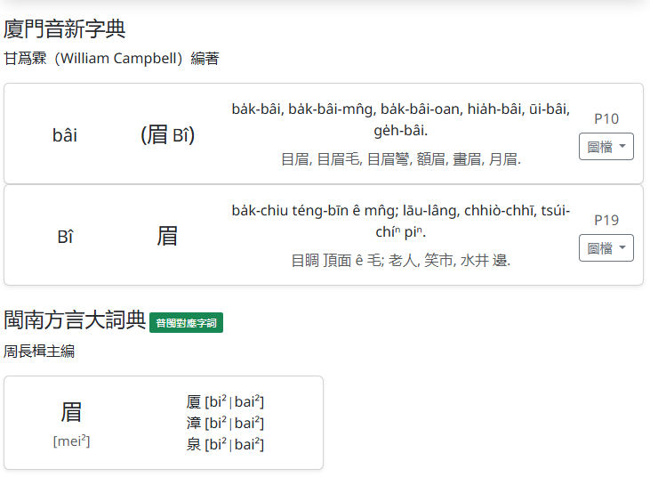 OCR:IMG:厦门音新字典甘为霖(WilliamCampbell)编著bak-ai-i-ng-i-n-aii P10bai (眉B1)geh-bai.圆档目眉,目眉毛,目眉弯,眉,眉,月眉.bak-chiuteng-binmng;lau-lang chhio-chhi,ui-P19Bi 眉chinpin.圆档目顶面毛;老人,笑市,水井闽南方言大词典普对应字词周长楫主编厦[bi2|bai?]漳[bi?|bai?][mei']泉[bi|bai?]