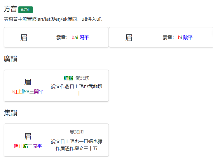OCR:IMG:方音修订中云霄音主流实际ian/iat与en/ek混同,ue并入ui.眉云霄:bai阳平眉云霄:bi阴平广韵眉脂武悲切说文作目上毛也武悲切明止脂B三开平二+集韵悲切眉说文目上毛也一日媚也隶明止脂三开平作眉通作麋文三十五