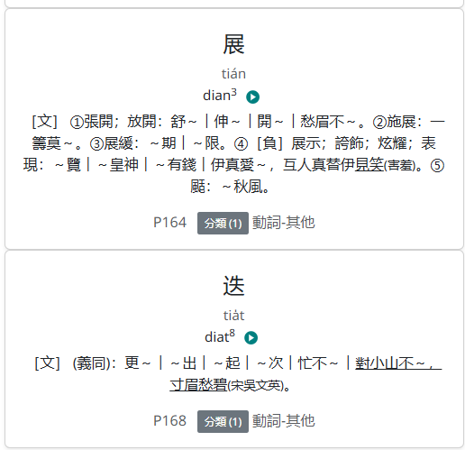 OCR:IMG:展tian dian3[文]张开;放开:舒|伸|开|愁眉不。施展:一筹莫。展缓:期|限。[负]展示;夸饰;炫耀;表现:览|皇神|有钱|伊真爱,互人真替伊见笑(害羞)。:秋风。P164分类(1)动词-其他迭tiat diat8[文](义同):更|出|起|次|忙不对小山不寸眉愁(宋吴文英)。P168分类(1)动词-其他