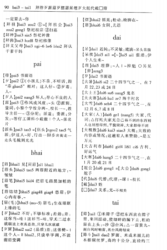 OCR:IMG:90bai3-tail 1拜徘歹派眉歹摆眉呆埋歹大舵代戴口筛一定要去你【摆】bhai2摇晃;松动:椅脚在【拜祖】bai3zou2=【拜祖公】bai3【眉】bhai6女阴,儿语zou2gongl祭祀祖宗扫墓【拜神】bai3sin5祭祀神像dai 【拜佛】bai3hud8祭祀佛像【拜义父母】bai3ngi-6be6bho2拜认干爹干妈【呆】dail迟钝;不灵敏:滴呆头呆脑【呆挨】daiSail=[】laiSail猥琐:伊个人生来pai 【埋】daiS埋葬:人I掉魁O另见[弹】zeng3【徘】paiS书面语【】dai2书面语【歹】pai2(小孩儿)不乖、不听话,跟【大暑】dai6si2二十四节气之一,在7“乖ghao5"相对:这人仔歹毒:月22,23或2日人【大士王】dai6su6uang5鬼名【万人】pai2nang5坏人;存心不良的人【大夫寨】dai6hulze7海丰村名【派】pai3作风或风度:头派别,【大雪】dai6seh4二十四节气之一,在量词:小黎个学校分两,校长一,教12月6,7或8日导主任一3分配;派遣;委派;分【大家(人)】dai6gel(nang5)大家,代发:答仔工课科小戴做个人张名词:打死大家无自己得不到的东西别片人也别想得到,干脆毁掉,大家都得不到【派头】pai3laoS=【伍头】ngou2lao5气【大概数】dai6kai3siao3大概:大致的派:伊这人-好,行出一脚步出街走一内容或情况;这遍有人来赞助,是五走头毛梳到光光万元【大吉利市】dai61gid4li61ci6吉利、bhai 好运气【大寒】dai6hang5二十四节气之一,在【眉】bhail见[眉】zil bhail 1月20或21日【眉头】bhaiStao5两眉附近的地方:【舵公】dai6gongl =【大公]dai6gongl 皱皱舵手【眉笔】bhaiSbid4把眉毛画黑加粗的【代】dai6代替;代理:课|校长笔【戴】dai3姓【眉结结】bhaiSgiag48giag4愁眉:伊【】dai7关系:无不相关心内有事,【眉(毛)】bhaiS(mo-5)眉毛;生在眼眶tai 上缘的毛【歹】bhai2不好;不够标准;差劲;差:【筛】tailD米筛子把东西放在筛子这家当哇1这衫当哇,穿无二过水里,来回摇动,使细碎的漏下去,粗的就破这上衣真差劲,只穿几次就破留在上头:沙台风:一雷簧九【歹屎】bhai2sai2(品质)差:这张椅|刮台风时响雷,兆台风将结束这个人Ibhai2,只读单字调,不读【筛斗】taildao2罗面、米或米面儿的前后变调木框铜丝罗,高约十公分,直径约三