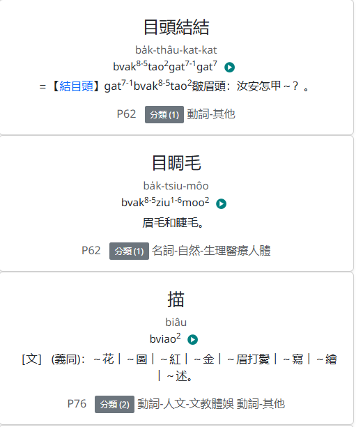 OCR:IMG:目头结结bak-thau-kat-kat bvak8-5tao2gat7-1gat7=【结目头】gat7-1bvak85tao2皱眉头:汝安怎甲?。P62分类(1)动词-其他目毛bak-tsiu-moo bvak8-5ziu1-6moo2眉毛和睫毛。P62分类(1)名词-自然-生理医疗人体描biau bviao2[文](义同):花|图|红|金|眉打|写|绘述。P76分类(2)动词-人文-文教体娱动词-其他