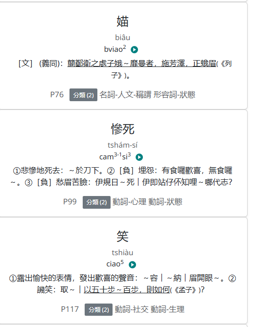 OCR:IMG:猫biau bviao2[文](义同):简之处子娥靡曼者,施芳泽,正蛾眉(《列子》)。P76分类(2)名词-人文-称谓形容词-状态惨死tsham-si cam3-1si3悲惨地死去:于刀下。[负]埋怨:有食欢喜,无食囉。[负]愁眉苦脸:伊规日死|伊即站仔怀知哩哪代志?P99分类(2)动词-心理动词-状态笑tshiau ciao5露出快的表情,发出欢喜的声音:容|纳眉开眼。笑:取|以五十步百步,则如何(《孟子》)?P117分类(2)动词-社交动词-生理