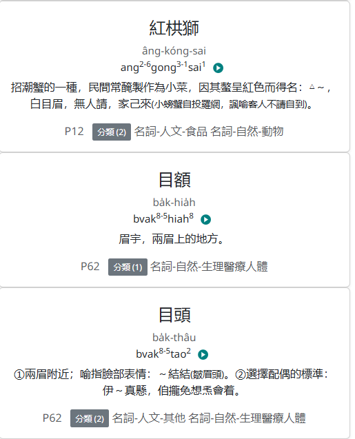 OCR:IMG:红棋狮ang-kong-sai ang2-6gong3-1sai1招潮蟹的一种,民间常制作为小菜,因其鳌呈红色而得名:,日目眉,无人请,家己来(小螃蟹自投罗网,喻客人不请自到)。P12分类(2)名词-人文-食品名词-自然-动物目额bak-hiah bvak8-5hiah8眉宇,两眉上的地方。P62分类(1)名词-自然-生理医疗人体目头bak-thau bvak8-5tao2两眉附近;喻指脸部表情:结结(眉头)。选择配偶的标准:伊真悬,伯免想会着。P62分类(2)名词-人文-其他名词-自然-生理医疗人体
