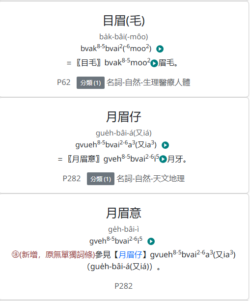 OCR:IMG:目眉(毛)bak-bai(-moo)bvak8-5bvai2(6moo2)=【目毛】bvak85moo'O眉毛。P62分类(1)名词-自然-生理医疗人体月眉仔gueh-bai-a(又ia)gvueh8-5bvai2-6a3(又ia3)=【月眉意】gveh85bvai2-6fO月牙。P282分类(1)名词-自然-天文地理月眉意geh-bai-i gveh8-5bvai2-6;5(新增,原无单独词条)参见【月眉仔】gvueh85bvai26a3(又ia3)(gueh-bai-a(又ia))。P282