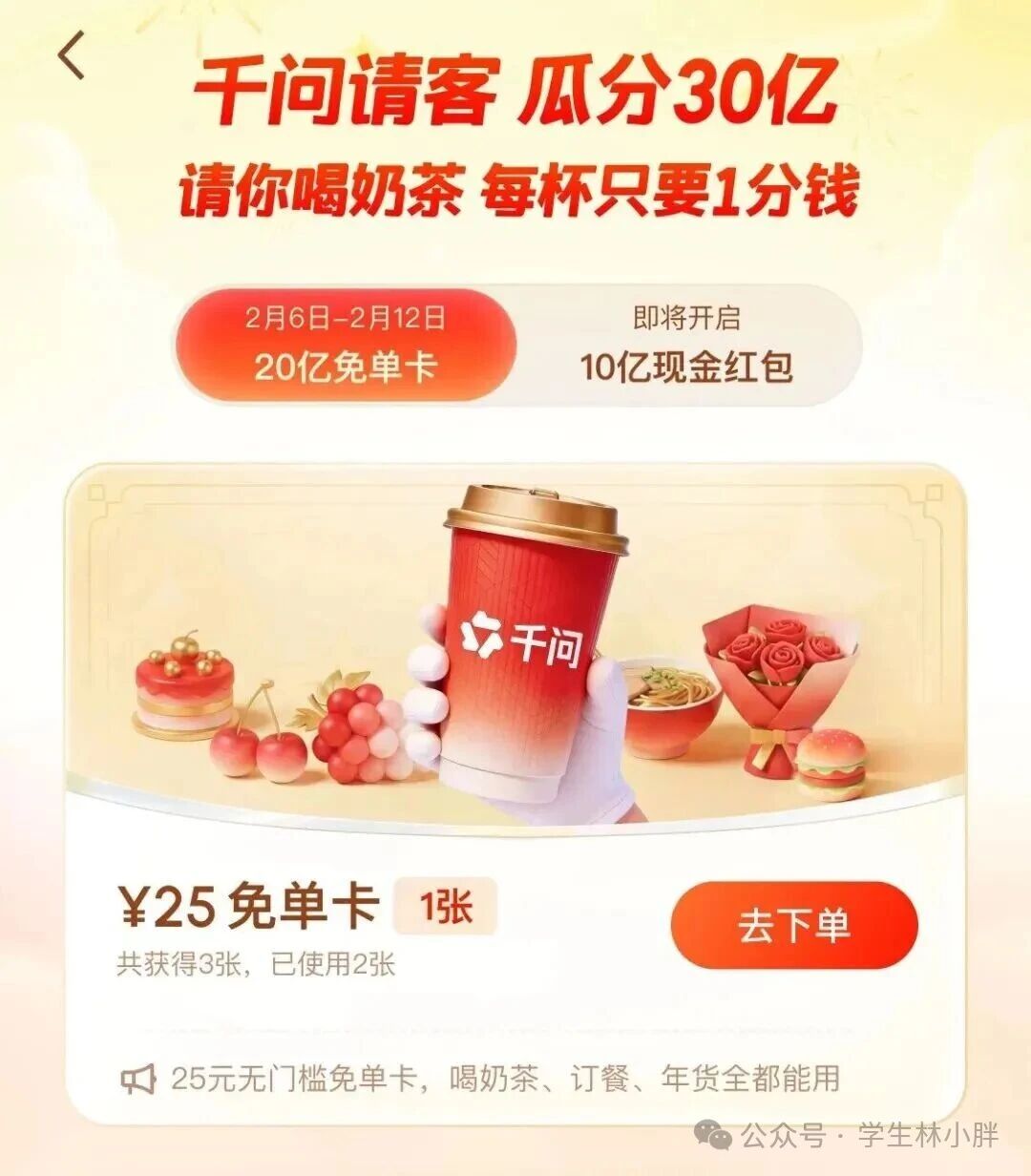 OCR:IMG:千问请客瓜分30亿 请你喝奶茶每杯只要1分钱 2月6日-2月12日 即将开启 20亿免单卡 10亿现金红包 千间 ¥25免单卡 1张 去下单 共获得3张,已使用2张 25元无门槛免单卡,喝奶茶、订餐、年货全都能用 公众号·学生林小胖