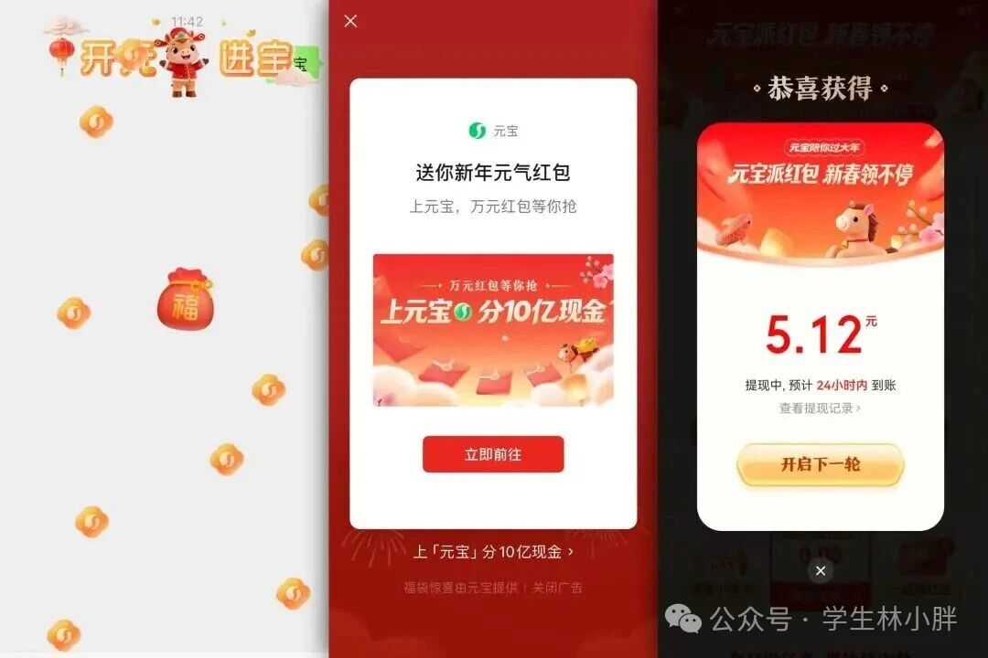 OCR:IMG:11:42 X 元宝派应器不 开烧书 进宝主 ·恭喜获得。 元宝 元宝赔你过大年 送你新年元气红包 元宝派红包新春领不停 上元宝,万元红包等你抢 万元红包等你抢 上元宝分10亿现金 5.12元 提现中,预计24小时内到账 查看提现记录 立即前往 开启下一轮 上「元宝分10亿现金 福袋惊喜由元宝提供|关闭厂告 公众号·学生林小胖