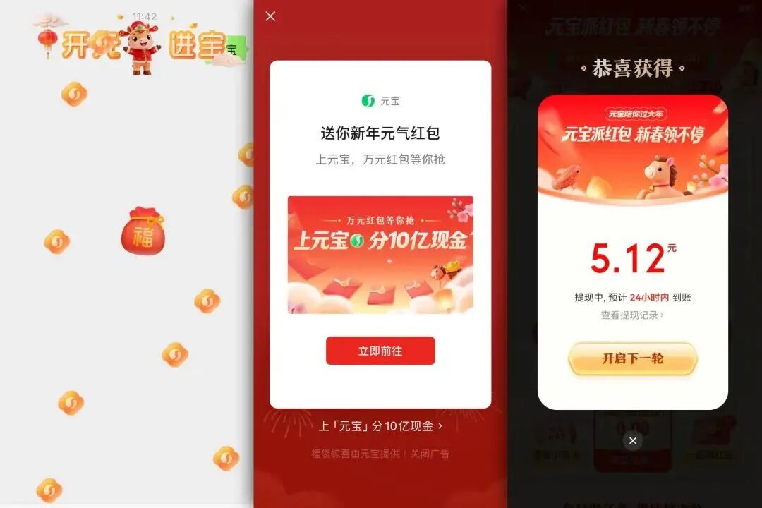 OCR:IMG:11:42 X 元宝旅打包斯香急不号 开纯尊 进宝 。恭喜获得。 J 元宝 元宝陪你过大年 送你新年元气红包 元宝派红包新春领不停 上元宝,万元红包等你抢 万元红包等你抢 上元宝分10亿现金 5.12 提现中,预计24小时内到账 查看提现记录 立即前往 开启下一轮 上「元宝分10亿现金> 福袋惊喜由无宝提供|关闭厂告