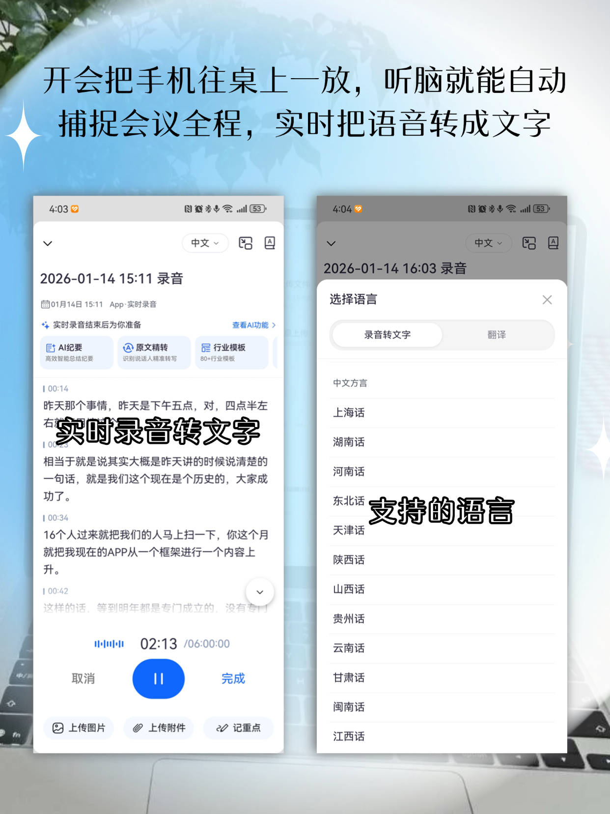 OCR:IMG:开会把手机往桌上一放,听脑就能自动 捕捉会议全程,实时把语音转成文字 4:03 53 4:04 中文 邵四 √ 文 2026-01-1415:11录音 2026-01-1416:03录音 01月14日15:11App实时录音 选择语言 X 实时录音结束后为你准备 查看AI功能) 录音转文字 翻译 AI纪要 原文精转 行业模板 高效智能总结纪要 说别说证人精凉转写 80+行业授板 1 00:14 中文方言 昨天那个事情,昨天是下午五点,对,四点半左 实时录音转文字 上海话 湖南话 相当于就是说其实大概是昨天讲的时候说清楚的 一句话,就是我们这个现在是个历史的,大家成 河南话 功了。 东北话 支持的语言 1 00:34 16个人过来就把我们的人马上扫一下,你这个月 天津话 就把我现在的APP从一个框架进行一个内容上 陕西话 升。 1 00:42 山西话 这样的话,等到明年都是专门成立的,没有专 贵州话 02:13 /06:00:00 云南话 取消 11 完成 甘肃话 闽南话 上传图片 上传附件 记重点 江西话
