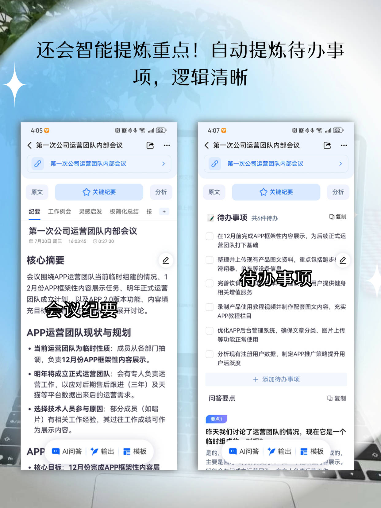 OCR:IMG:还会智能提炼重点!自动提炼待办事 项,逻辑清晰 4:05 额52) 4:07 目52 <第一次公司运营团队内部会议 D ·.. <第一次公司运营团队内部会议 C 第一次公司运营团队内部会议 S 第一次公司运营团队内部会议 原文 关键纪要 分析 原文 关键纪要 分析 纪要 工作例会 灵感启发 极简化总结 按 待办事项共6件待办 复制 第一次公司运营团队内部会议 在12月前完成APP框架性内容展示,为后续正式运 四7月30日周三 16:03:45 0:27:30 营团队打下基础 核心摘要 2 整理并上传现有产品图文资料,重点包括跑步1 会议围绕APP运营团队当前临时组建的情况、1 用户提供健身 2月份APP框架性内容展示任务、明年正式运营 相关增值服务 团队成立计划以及APP2.0版本功能、内容填 绝画 展开讨论。 录制产品使用教程视频并制作配套图文内容,充实 APP教程栏目 APP运营团队现状与规划 优化APP后台管理系统,确保文章分类、图片上传 等功能正常使用 ·当前运营团队为临时性质:成员从各部门抽 分析现有注册用户数据,制定APP推广策略提升用 调,负责12月份APP框架性内容展示。 户活跃度 ·明年将成立正式运营团队:会有专人负责运 营工作,以应对后期售后跟进(三年)及天 十添加待办事项 猫等平台数据出来后的运营需求。 问答要点 复制 ·选择技术人员参与原因:部分成员(如唱 片)有相关工作经验,其过往工作成绩可作 要点1 为展示内容。 昨天我们讨论了运营团队的情况,现在它是一个 临时组 APP AI问答输出模板 是的, A问答输出模板的 ·核心目标:12月份完成APP框架性内容展 主要是 展示