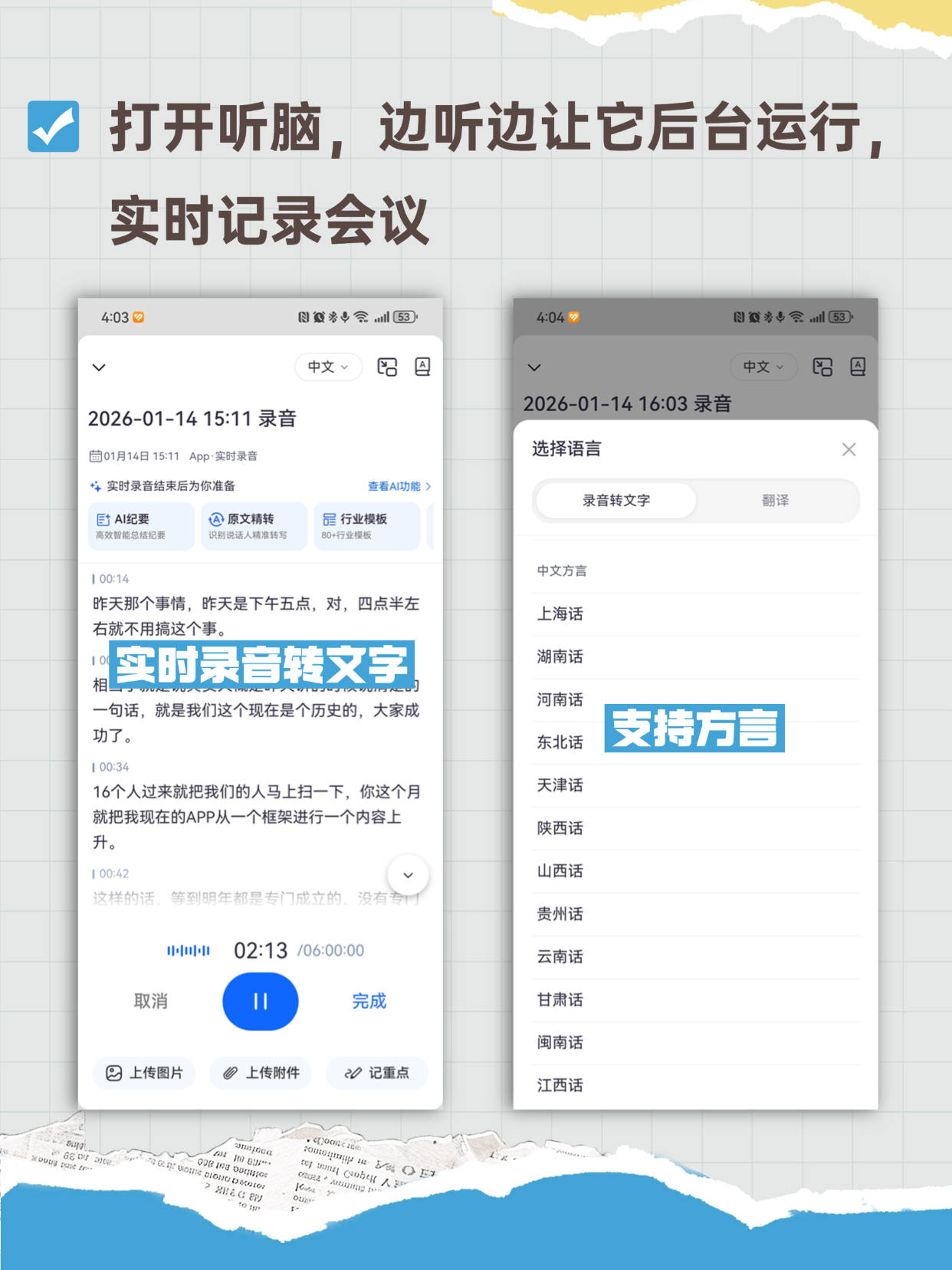 OCR:IMG:打开听脑,边听边让它后台运行 实时记录会议 4:03 4:04 中文 邵四 V 文 2026-01-1416:03录音 2026-01-1415:11录音 01月14日15:11App·实时录音 选择语言 十 实时录音结束后为你准备 查看A功能) 录音转文字 翻译 A纪要 原文精转 行业模板 真效智能总尼要 识期测达人准 80+行业 1 00:14 中文方言 昨天那个事情,昨天是下午五点,对,四点半左 上海话 右就不用搞这个事。 实时录音转文字 湖南话 一句话,就是我们这个现在是个历史的,大家成 河南话 支持方言 功了。 东北话 100:34 16个人过来就把我们的人马上扫一下,你这个月 天津话 就把我现在的APP从一个框架进行一个内容上 陕西话 升。 [ 00:42 山西话 这样的话 等到明年都是专门成立的 没有 贵州话 02:13 /06:00:00 云南话 取消 11 完成 甘肃话 闽南话 上传图片 上传附件 记重点 江西话 Kus
