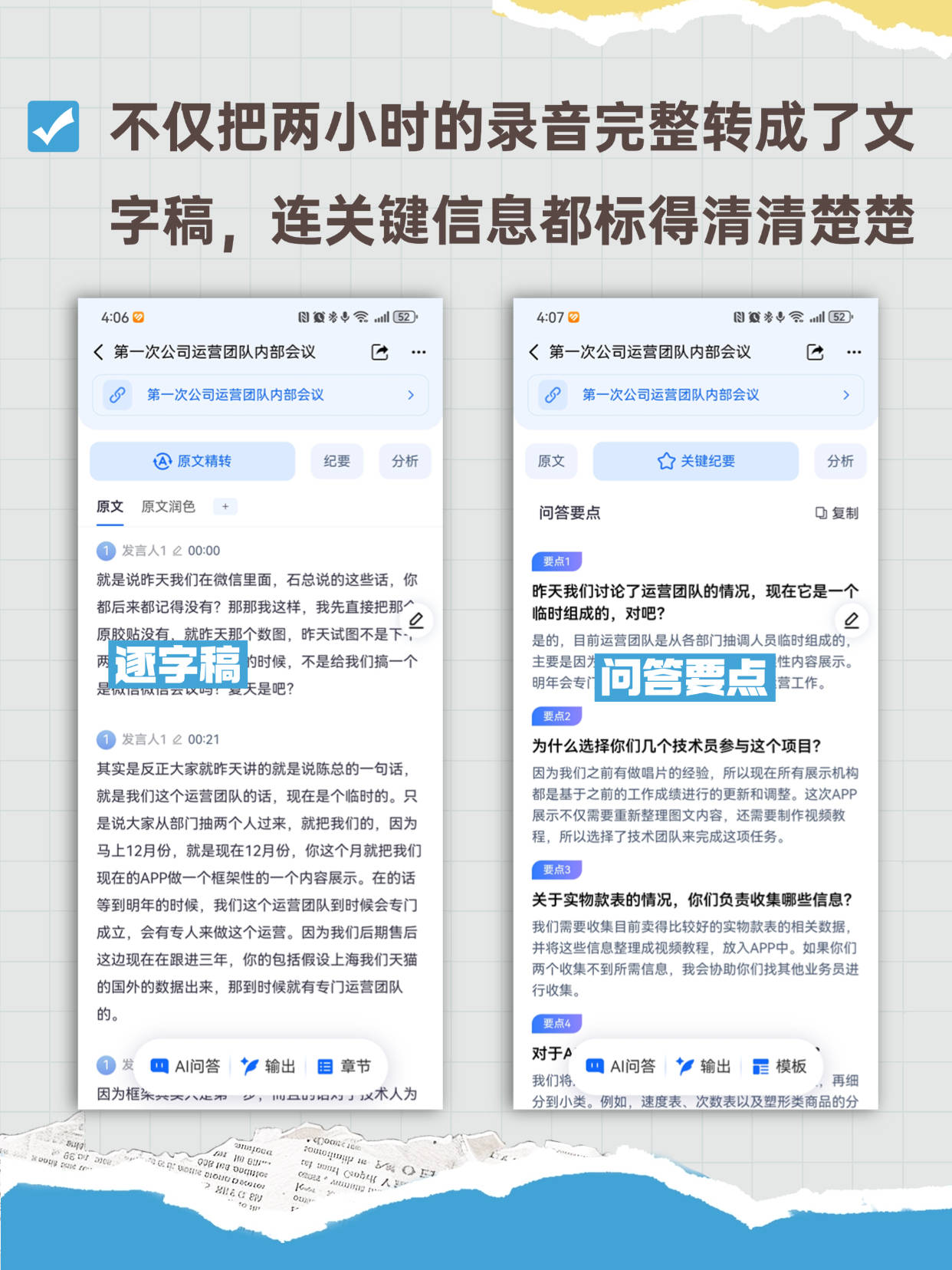 OCR:IMG:不仅把两小时的录音完整转成了文 字稿,连关键信息都标得清清楚楚 4:06 2 4:07 目2 <第一次公司运营团队内部会议 B <第一次公司运营团队内部会议 D 第一次公司运营团队内部会议 y 第一次公司运营团队内部会议 原文精转 纪要 分析 原文 关键纪要 分析 原文 原文润色 问答要点 复制 发言人100:00 要点1 就是说昨天我们在微信里面,石总说的这些话,你 昨天我们讨论了运营团队的情况,现在它是一个 都后来都记得没有?那那我这样,我先直接把那 C 临时组成的,对吧? 原胶贴没有,就昨天那个数图,昨天试图不是下 2 逐字稿 是的,目前运营团队是从各部门抽调人员临时组成的, 为时候,不是给我们搞一个 主要是因光 问答要点 性内容展示。 是做信做信云认吗!爱天是吧? 明年会专门 营工作。 要点2 ①发言人100:21 为什么选择你们几个技术员参与这个项目? 其实是反正大家就昨天讲的就是说陈总的一句话, 因为我们之前有做唱片的经验,所以现在所有展示机构 就是我们这个运营团队的话,现在是个临时的。只 都是基于之前的工作成绩进行的更新和调整。这次APP 是说大家从部门抽两个人过来,就把我们的,因为 展示不仅需要重新整理图文内容,还需要制作视频教 马上12月份,就是现在12月份,你这个月就把我们 程,所以选择了技术团队来完成这项任务。 现在的APP做一个框架性的一个内容展示。在的话 费点3 等到明年的时候,我们这个运营团队到时候会专门 关于实物款表的情况,你们负责收集哪些信息? 成立,会有专人来做这个运营。因为我们后期售后 我们需要收集目前卖得比较好的实物款表的相关数据, 这边现在在跟进三年,你的包括假设上海我们天猫 并将这些信息整理成视频教程,放入APP中。如果你们 两个收集不到所需信息,我会协助你们找其他业务员进 的国外的数据出来,那到时候就有专门运营团队 行收集。 的。 要点4 发 AI问答输出目章节 对于A 我们将 四AI问答 输出 模板 因为框东兴 再细 分到小类。例如,速度表、次数表以及量形类商品的分 fv 品