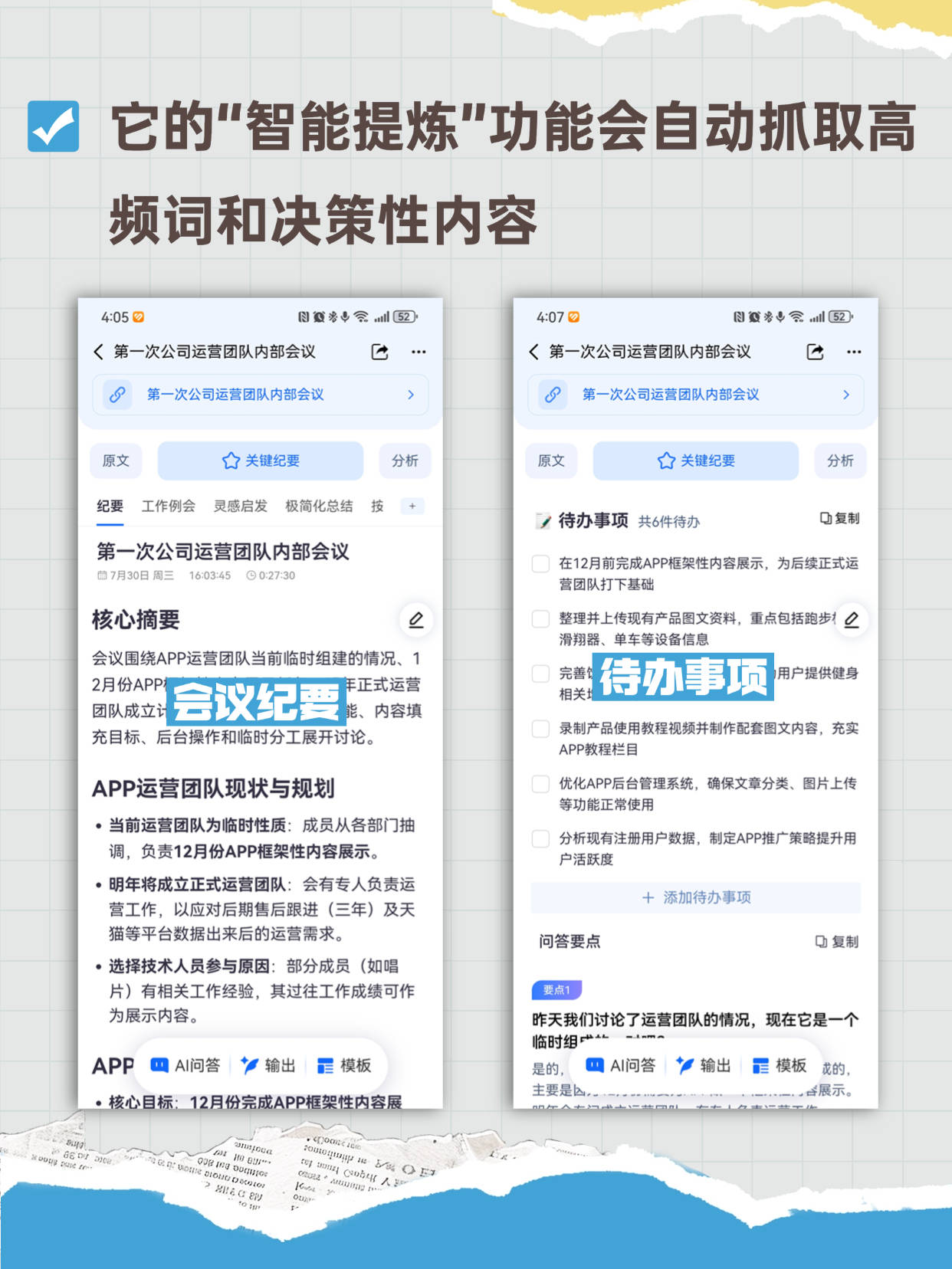 OCR:IMG:它的“智能提炼”功能会自动抓取高 频词和决策性内容 4:05 2 4:07 目2 <第一次公司运营团队内部会议 B <第一次公司运营团队内部会议 D 第一次公司运营团队内部会议 少 第一次公司运营团队内部会议 原文 关键纪要 分析 原文 关键纪要 分析 纪要 工作例会灵感启发极简化总结技 待办事项共6件待办 复制 第一次公司运营团队内部会议 16:03:45G0:27:30 在12月前完成APP框架性内容展示,为后续正式运 7月30日周三 营团队打下基础 核心摘要 整理并上传现有产品图文资料,重点包括跑步 滑翔器、单车等设备信息 会议围绕APP运营团队当前临时组建的情况、1 待办事项 会议纪要 年正式运营 完善 用户提供健身 2月份APP 相关 团队成立计 能、内容填 充目标、后台操作和临时分工展开讨论。 录制产品使用教程视频并制作配套图文内容,充实 APP教程栏目 APP运营团队现状与规划 优化APP后台管理系统,确保文章分类、图片上传 等功能正常使用 ·当前运营团队为临时性质:成员从各部门抽 分析现有注册用户数据,制定APP推广策略提升用 调,负责12月份APP框架性内容展示。 户活跃度 ·明年将成立正式运营团队:会有专人负责运 营工作,以应对后期售后跟进(三年)及天 十添加待办事项 猫等平台数据出来后的运营需求。 问答要点 复制 ·选择技术人员参与原因:部分成员(如唱 片)有相关工作经验,其过往工作成绩可作 要点1 为展示内容。 昨天我们讨论了运营团队的情况,现在它是一个 临时组 APP AI问答输出模板 是的, A问答 输出 模板我的 ·核心目标:12月份完成APP框架性内容展 主要是 展示 K