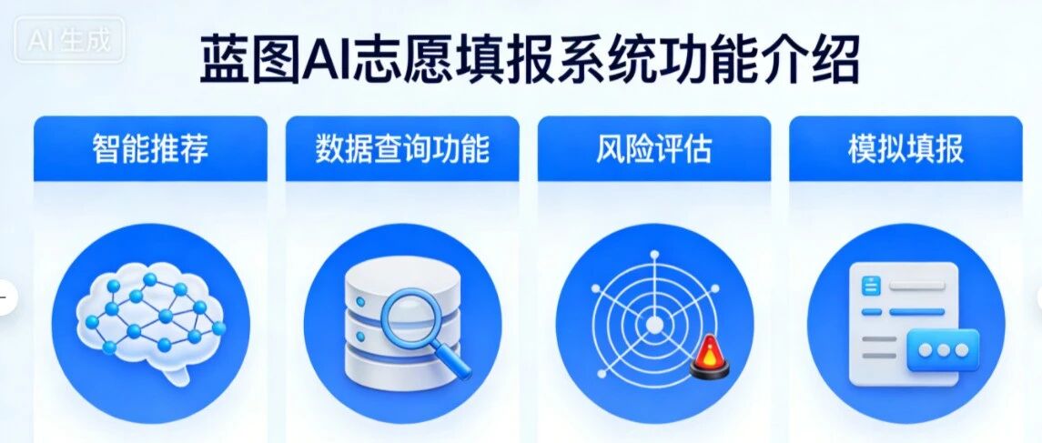 高考志愿填报,是孩子人生的关键十字路口,更是家长心中的 “头等大事”—— 怕分数浪费、怕专业不对口、怕院校选得偏、怕规则搞不清!宜宾蓝图生涯规划深知家长的焦虑与需求,特此推出【蓝图AI愿填报系统】。系统以本地化服务为根基,整合权威测评、全面数据与智能算法,打造 “测、查、学、问、填” 一站式解决方案,从职业适配到志愿落地全程护航,帮宜宾学子用精准填报叩响理想大学的大门。以下为您详细解读系统六大核心功能:点击图片进入小程序