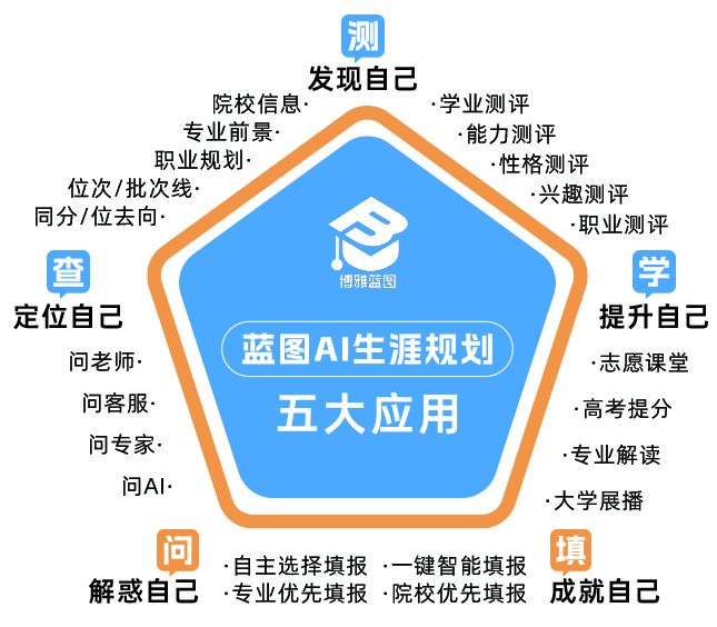 OCR:IMG:测发现自己院校信息··学业测评专业前景··能力测评职业规划··性格测评位次/批次线··兴趣测评同分/位去向··职业测评查学博雅蓝图定位自己提升自己蓝图ai生涯规划问老师··志愿课堂问客服·五大应用·高考提分问专家··专业解读问AI··大学展播填·自主选择填报·一键智能填报解惑自己·专业优先填报·院校优先填报成就自己
