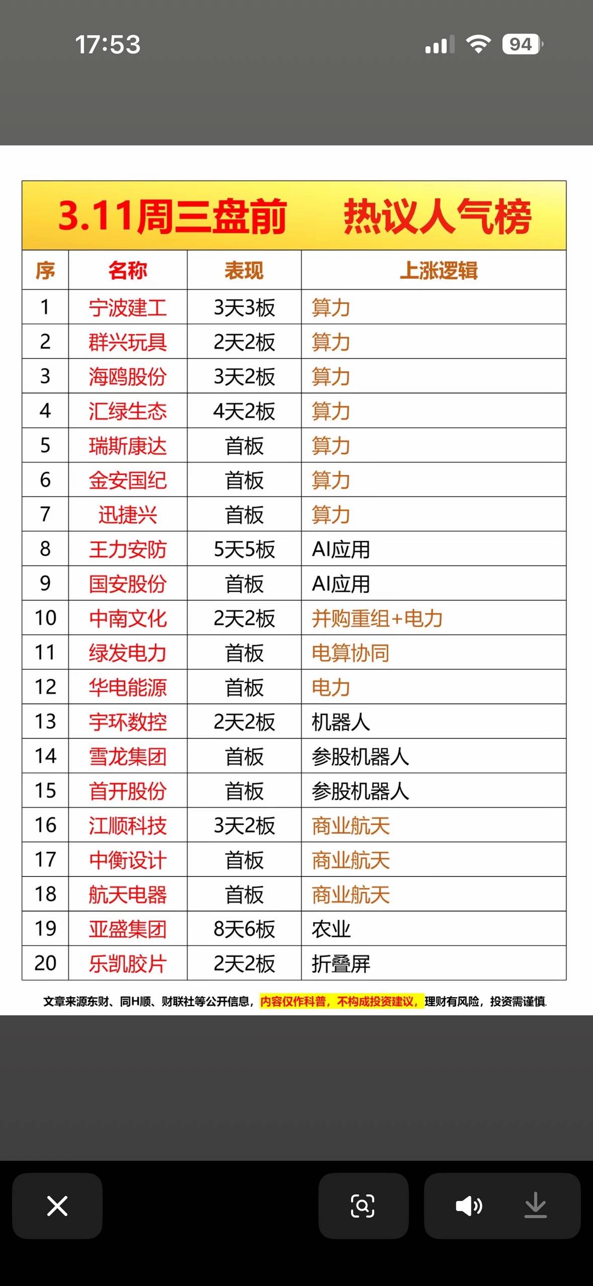 OCR:IMG:17:53 三94 3.11周三盘前 热议人气榜 序 名称 表现 上涨逻辑 1 宁波建工 3天3板 算力 2 群兴玩具 2天2板 算力 3 海鸥股份 3天2板 算力 4 汇绿生态 4天2板 算力 5 瑞斯康达 首板 算力 6 金安国纪 首板 算力 7 迅捷兴 首板 算力 8 王力安防 5天5板 AI应用 9 国安股份 首板 AI应用 10 中南文化 2天2板 并购重组+电力 11 绿发电力 首板 电算协同 12 华电能源 首板 电力 13 宇环数控 2天2板 机器人 14 雪龙集团 首板 参股机器人 15 首开股份 首板 参股机器人 16 江顺科技 3天2板 商业航天 17 中衡设计 首板 商业航天 18 航天电器 首板 商业航天 19 亚盛集团 8天6板 农业 20 乐凯胶片 2天2板 折叠屏 文章来源东财、同H顺、财联社等公开信息, 内容仅作科普,不构成投资建议,理财有风险,投资需谨慎 × 包 D √