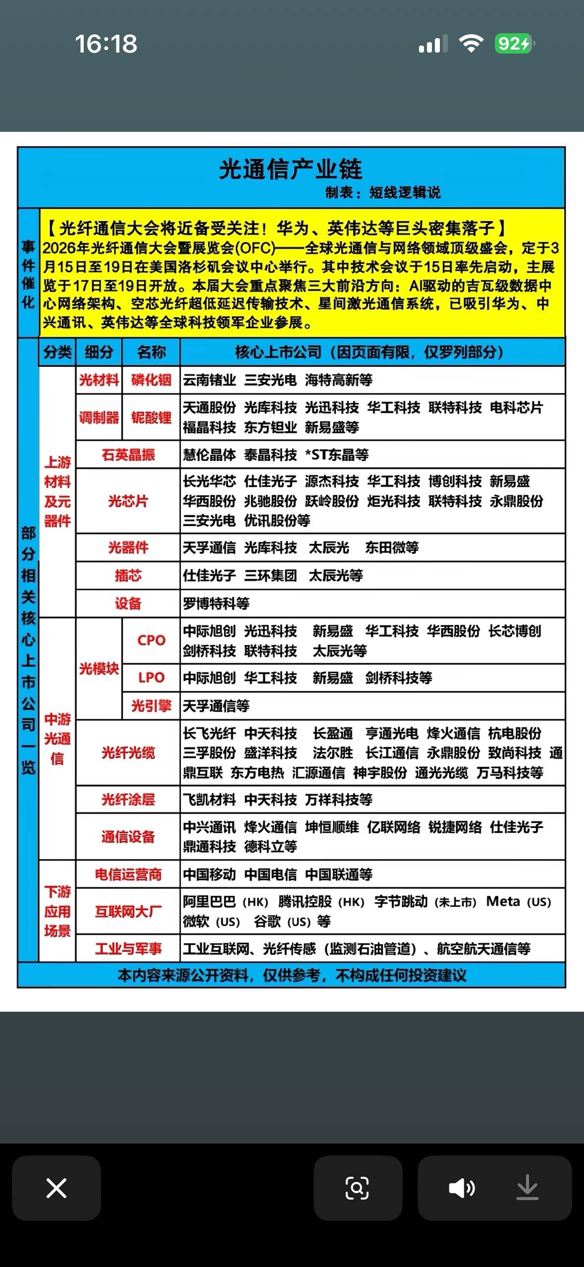 OCR:IMG:16:18 三 924 光通信产业链 制表:短线逻辑说 【光纤通信大会将近备受关注!华为、英伟达等巨头密集落子】 串 2026年光纤通信大会暨展览会(OFC)全球光通信与网络领域顶级盛会,定于3 件 月15日至19日在美国洛杉矶会议中心举行。其中技术会议于15日率先启动,主展 催 览于17日至19日开放。本届大会重点聚焦三大前沿方向:A驱动的吉瓦级数据中 化 心网络架构、空芯光纤超低延迟传输技术、星间激光通信系统,已吸引华为、中 兴通讯、英伟达等全球科技领军企业参展。 分类 细分 名称 核心上市公司(因页面有限,仅罗列部分) 光材料 磷化铟 云南锗业三安光电海特高新等 天通股份光库科技光迅科技华工科技联特科技电科芯片 调制器 昵酸锂 福晶科技东方钽业新易盛等 上游 石英晶振 慧伦晶体泰晶科技*ST东晶等 材料 长光华芯仕佳光子源杰科技华工科技博创科技新易盛 及元 光芯片 华西股份兆驰股份跃岭股份炬光科技联特科技永鼎股份 器件 三安光电优讯股份等 部 分 光器件 天孚通信光库科技太辰光东田微等 相关核心上市 插芯 仕佳光子三环集团太辰光等 设备 罗博特科等 中际旭创光迅科技 CPO 新易盛华工科技华西股份长芯博创 剑桥科技联特科技 太辰光等 光模块 LPO 中际旭创华工科技 新易盛剑桥科技等 公 光引擎 天孚通信等 司 中游 光通 长飞光纤中天科技 长盈通亨通光电烽火通信杭电股份 信 光纤光缆 三孚股份盛洋科技 法尔胜长江通信永鼎股份致尚科技通 览 鼎互联东方电热汇源通信神宇股份通光光缆万马科技等 光纤涂层 飞凯材料中天科技万祥科技等 中兴通讯烽火通信坤恒顺维亿联网络锐捷网络仕佳光子 通信设备 鼎通科技德科立等 电信运营商 中国移动中国电信中国联通等 下游 阿里巴巴(HK)腾讯控股(HK)字节跳动(未上市)Meta(US) 应用 互联网大厂 微软(US) 场景 谷歌(US)等 工业与军事 工业互联网、光纤传感(监测石油管道)、航空航天通信等 本内容来源公开资料, 仅供参考, 不构成任何投资建议 X ℃ D