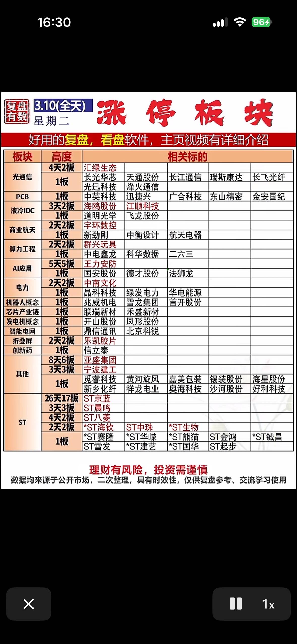 OCR:IMG:16:30 . D 964 复盘 3.10(全天) 涨停板块 有数 星期二 好用的复盘, 看盘软件,主页视频有详细介绍 板块 高度 相关标的 4天2板 汇绿生态 光通信 1板 长光华芯 天通股份 长江通信 瑞斯康达 长飞光纤 光迅科技 烽火通信 PCB 1板 中英科技 迅捷兴 广合科技东山精密金安国纪 3天2板 海鸥股份 江顺科技 液冷IDC 1板 道明光学 飞龙股份 2天2板 宇环数控 商业航天 1板 新劲刚 中衡设计 航天电器 2天2板 群兴玩具 算力工程 1板 中电鑫龙 科华数据 二六三 5天5板 王力安防 AI应用 1板 国安股份 德才股份 法狮龙 2天2板 电力 中南文化 1板 晶科科技 绿发电力 华电能源 机器人概念 1板 兆威机电 雪龙集团 首开股份 芯片产业链 1板 联瑞新材 禾盛新材 发电机概念 1板 开山股份 凤形股份 智能电网 1板 鼎信通讯 北京科锐 折叠屏 2天2板 乐凯胶片 创新药 1板 信立泰 8天6板 亚盛集团 其他 3天3板 宁波建工 觅睿科技 黄河旋风 嘉美包装 锡装股份 海星股份 1板 新乡化纤 祥龙电业 奥海科技 沙河股份 好利科技 26天17板 ST京蓝 3天3板 ST晨鸣 4天2板 ST八菱 ST 2天2板 *ST海钦 ST中珠 *ST生物 1板 *ST赛隆 *ST华嵘 *ST熊猫 ST金鸿 *ST昌 ST雪发 *ST建艺 *ST国华 ST起步 理财有风险,投资需谨慎 数据均来源于公开市场,二次整理,具有时效性,仅供复盘参考、交流学习使用 × 0 1x