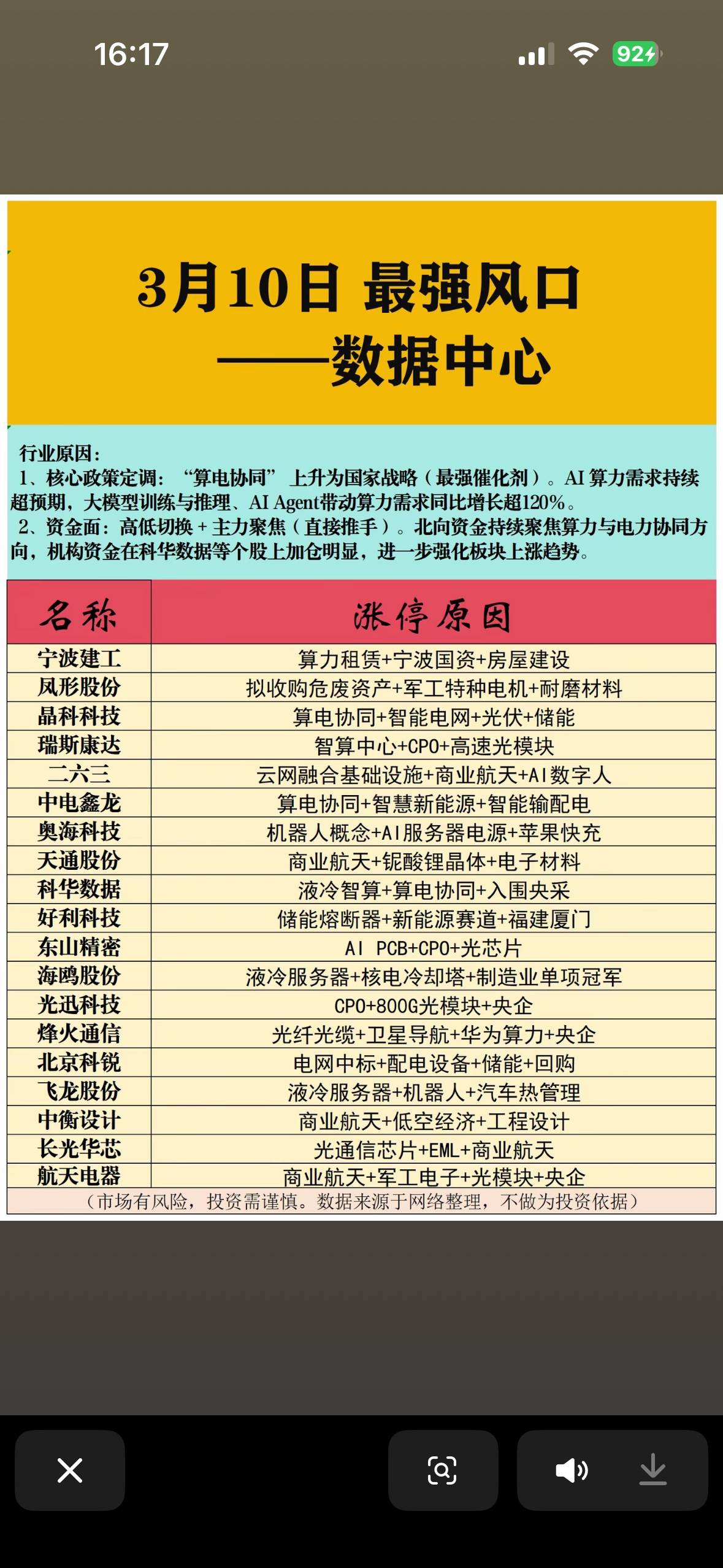 OCR:IMG:16:17 三》 924 3月10日最强风口 数据中心 行业原因: 1、核心政策定调:“算电协同”上升为国家战略(最强催化剂)。AI算力需求持续 超预期,大模型训练与推理、AIAgent带动算力需求同比增长超120%。 2、资金面:高低切换+主力聚焦(直接推手)。北向资金持续聚焦算力与电力协同方 向,机构资金在科华数据等个股上加仓明显,进一步强化板块上涨趋势。 名称 涨停原因 宁波建工 算力租赁+宁波国资+房屋建设 凤形股份 拟收购危废资产+军工特种电机+耐磨材料 晶科科技 算电协同+智能电网+光伏+储能 瑞斯康达 智算中心+CPO+高速光模块 二六三 云网融合基础设施+商业航天+A1数字人 中电鑫龙 算电协同+智慧新能源+智能输配电 奥海科技 机器人概念+AI服务器电源+苹果快充 天通股份 商业航天+酸锂晶体+电子材料 科华数据 液冷智算+算电协同+入围央采 好利科技 储能熔断器+新能源赛道+福建厦门 东山精密 AIPCB+CPO+光芯片 海鸥股份 液冷服务器+核电冷却塔+制造业单项冠军 光迅科技 CPO+800G光模块+央企 烽火通信 光纤光缆+卫星导航+华为算力+央企 北京科锐 电网中标+配电设备+储能+回购 飞龙股份 液冷服务器+机器人+汽车热管理 中衡设计 商业航天+低空经济+工程设计 长光华芯 光通信芯片+EML+商业航天 航天电器 商业航天+军工电子+光模块+央企 (市场有风险,投资需谨慎。数据来源于网络整理,不做为投资依据) X g D) W