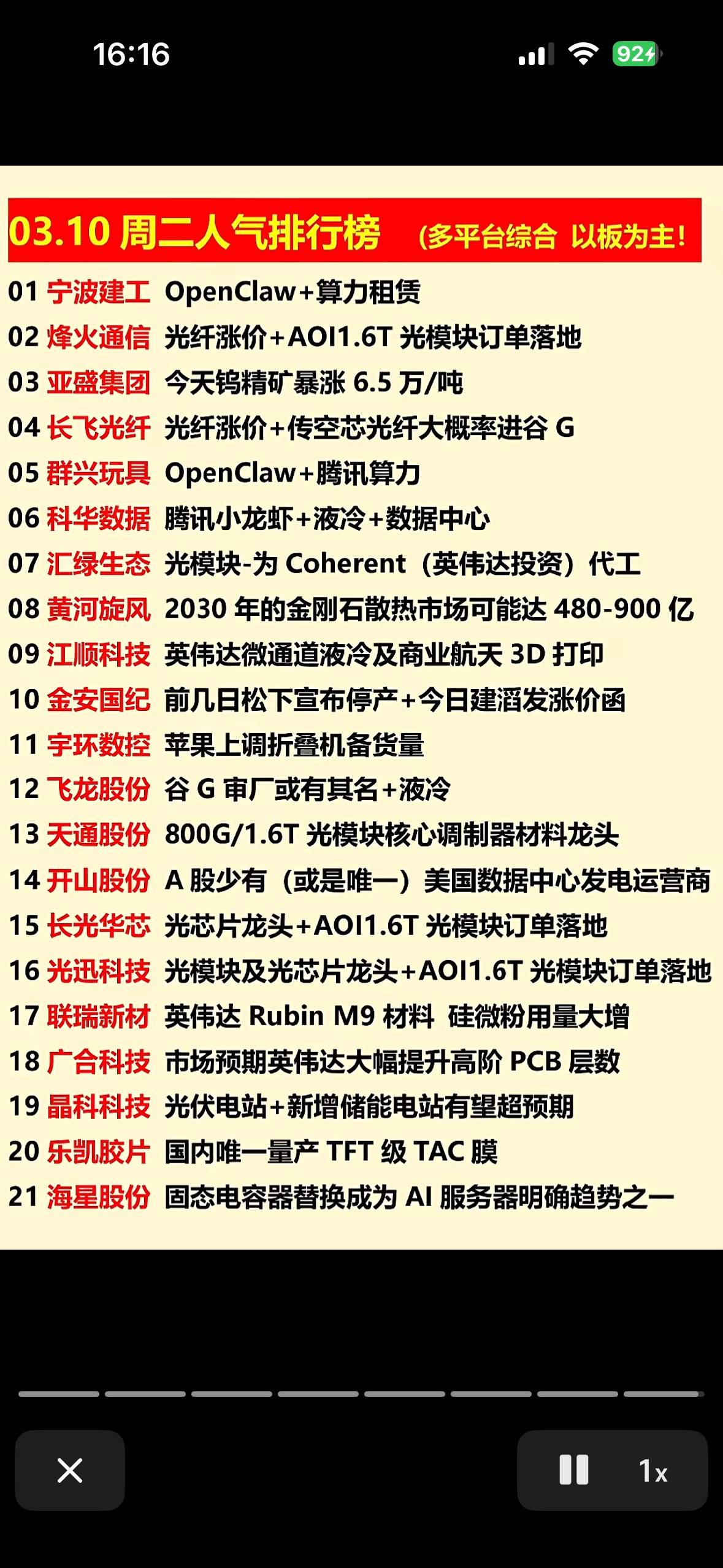 OCR:IMG:16:16 924 03.10周二人气排行榜 (多平台综合 以板为主! 01宁波建工OpenClaw+算力租赁 02烽火通信光纤涨价+AO11.6T光模块订单落地 03亚盛集团 今天钨精矿暴涨6.5万/吨 04长飞光纤 光纤涨价+传空芯光纤大概率进谷G 05群兴玩具 OpenClaw+腾讯算力 06科华数据朋 腾讯小龙虾+液冷+数据中心 07汇绿生态光模块-为Coherent(英伟达投资)代工 08黄河旋风2030年的金刚石散热市场可能达480-900亿 09江顺科技英伟达微通道液冷及商业航天3D打印 10金安国纪 前几日松下宣布停产+今日建滔发涨价函 11宇环数控 苹果上调折叠机备货量 12飞龙股份 谷G审厂或有其名+液冷 13天通股份8 800G/1.6T光模块核心调制器材料龙头 14开山股份A股少有(或是唯一)美国数据中心发电运营商 15长光华芯光芯片龙头+A011.6T光模块订单落地 16光迅科技 光模块及光芯片龙头+AO11.6T光模块订单落地 17联瑞新材英伟达RubinM9材料硅微粉用量大增 18广合科技 市场预期英伟达大幅提升高阶PCB层数 19晶科科技光伏电站+新增储能电站有望超预期 20乐凯胶片 国内唯一量产TFT级TAC膜 21海星股份固态电容器替换成为AI服务器明确趋势之一 × 1x