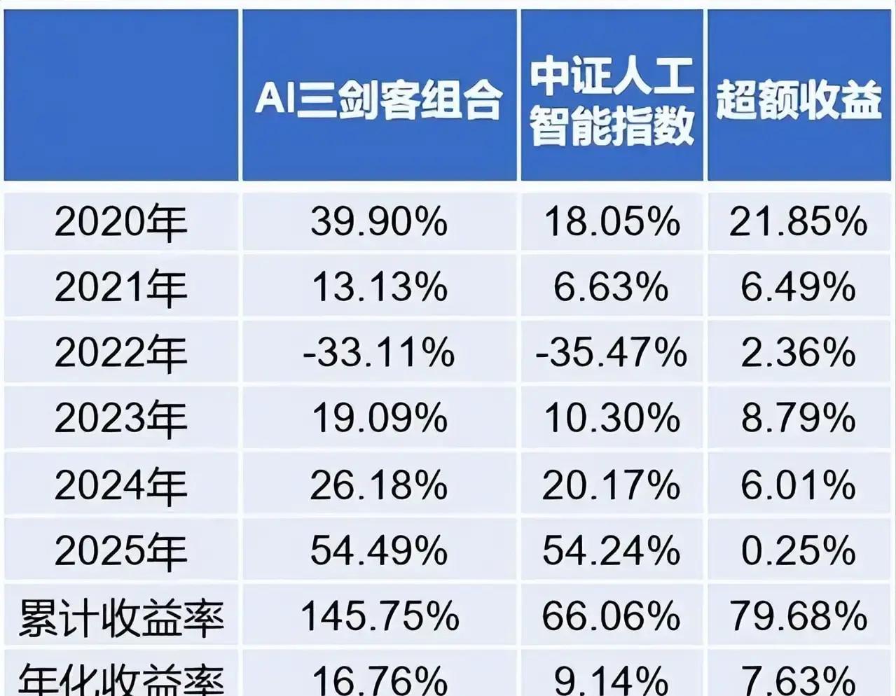 OCR:IMG:中证人工 AI三剑客组合 超额收益 智能指数 2020年 39.90% 18.05% 21.85% 2021年 13.13% 6.63% 6.49% 2022年 -33.11% -35.47% 2.36% 2023年 19.09% 10.30% 8.79% 2024年 26.18% 20.17% 6.01% 2025年 54.49% 54.24% 0.25% 累计收益率 145.75% 66.06% 79.68% 年化收益率 16.76% 9.14% 7.63%