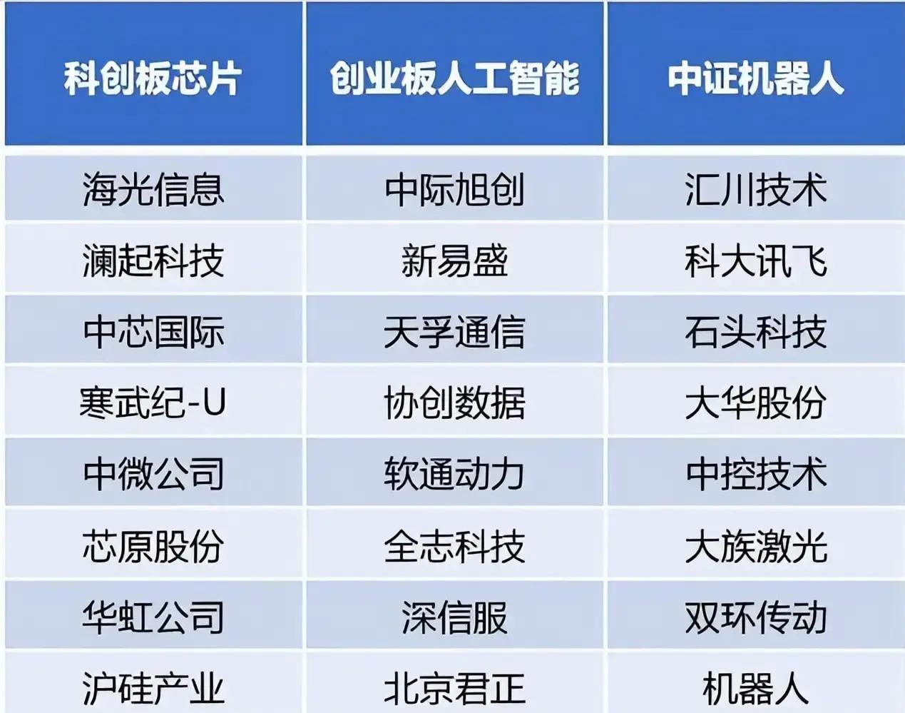 OCR:IMG:科创板芯片 创业板人工智能 中证机器人 海光信息 中际旭创 汇川技术 澜起科技 新易盛 科大讯飞 中芯国际 天孚通信 石头科技 寒武纪-U 协创数据 大华股份 中微公司 软通动力 中控技术 芯原股份 全志科技 大族激光 华虹公司 深信服 双环传动 沪硅产业 北京君正 机器人
