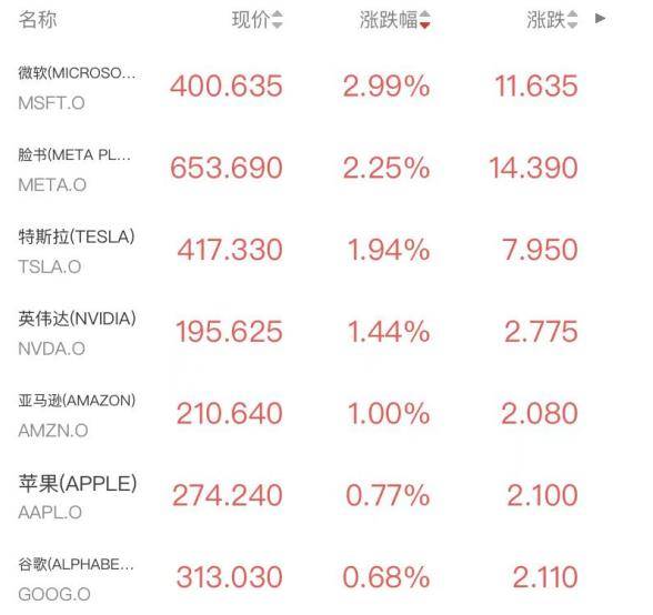 明星科技股普涨,英伟达涨1.44%,微软涨2.99%,Meta涨2.25%,特斯拉涨1.94%,亚马逊涨1%,苹果和谷歌涨约0.7%。