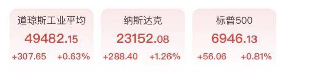 美股周三上涨,延续前一交易日涨势。市场对人工智能带来的冲击与成本的担忧退居次位,取而代之的是对这项新兴技术潜在利好的重新乐观情绪。截至收盘,道指涨307.65点,涨幅0.63%,报49482.15点,纳指涨1.26%,报23152.08点,标普500指数涨0.81%,报6946.13点。