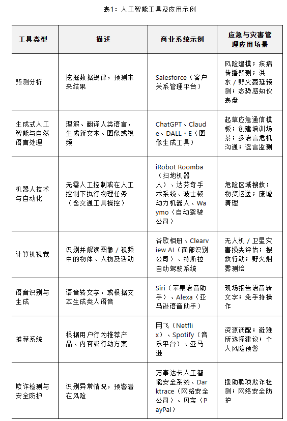 OCR:IMG:表1:人工智能工具及应用示例 工具类型 描述 商业系统示例 应急与灾害管 理应用场景 风险建模;疾病 挖掘数据规律,预测未 传播预测;洪 预测分析 Salesforce(客户 来结果 水/野火蔓延预 关系管理平台) 测:态势感知仪 表盘 生成式人工 理解、翻译人类语言, 起草应急通信模 ChatGPT、Claud 板;创建培训场 智能与自然 生成新文本、图像或视 e、DALL·E(图 景;多语言危机 语言处理 频 像生成工具) 沟通;谣言监测 iRobot Roomba (扫地机器 机器人技术 无需人工控制或在人工 人)、达芬奇手 危险区域搜救; 控制下执行物理任务 与自动化 术系统、波士顿 物资运送;废墟 (含交通工具操控) 动力机器人、Wa 清理 ymo(自动驾驶 公司) 谷歌相册、Clearv 无人机/卫星灾 识别并解读图像/视频 计算机视觉 iewAl(面部识别 害损失评估;搜 中的物体、人物及活动 公司)、特斯拉 救行动;野火烟 自动驾驶系统 雾测绘 语音识别与 语音转文字,或根据文 Siri(苹果语音助 现场报告语音转 生成 手)、Alexa(亚 文字;免手持操 本生成类人语音 马逊语音助手) 作 网飞(Netfli 资源调配;避难 推荐系统 根据用户行为推荐产 x)、Spotify(音 乐平台)、亚马 所选择建议;个 品、内容或行动方案 人风险预警 逊 万事达卡人工智 识别异常情况,预警潜 能安全系统、Dar 欺诈检测与 援助款项欺诈检 在风险 ktrace(网络安全 测:网络安全防 安全防护 公司)、贝宝(P 护 ayPal)