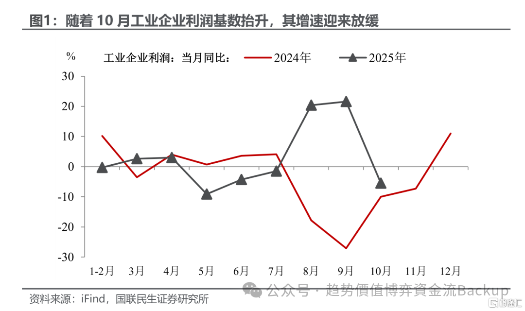 OCR:IMG:图1:随着10月工业企业利润基数抬升,其增速迎来放缓%工业企业利润:当月同比:2024年一—2025年3020100-10-20-301-2月3月4月5月6月7月8月9月10月11月月12月公众号·趋势价值博弈资金流Backup 资料来源:iFind,国联民生证券研究所G峰隆C