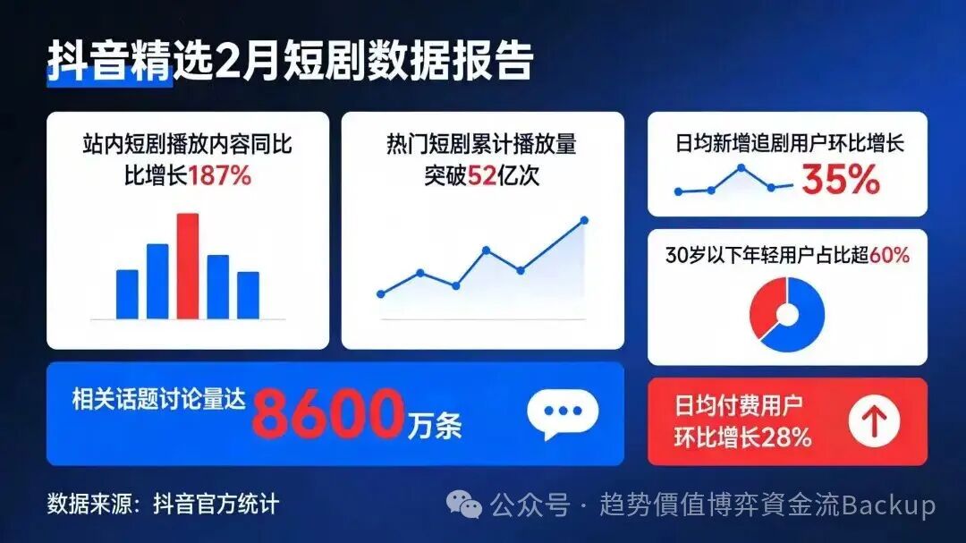 OCR:IMG:抖音精选2月短剧数据报告站内短剧播放内容同比热门短剧累计播放量日均新增追剧用户环比增长比增长187%突破52亿次35%30岁以下年轻用户占比超60%相关话题讨论量达8600万条日均付费用户环比增长28%数据来源:抖音官方统计公众号·趋势价值博弈资金流Backup