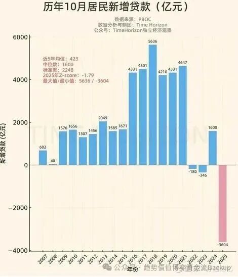 OCR:IMG:历年10月居民新增贷款(亿元)数据分析与制图:TimeHorizon 数据来源:PBOC 公众号:TimeHorizon独立经济观察10005636近5年均值:423中位数:160045014647标准差:224843312025年Z-score:-1.79421043314000最大值/最小值:5636/-3604200020491576165614561585167116001307682040-180-346-2000-3604-400020072008200920102011201220120152012012012019202202202023202:2025公众年·趋势价值博究营金流agk