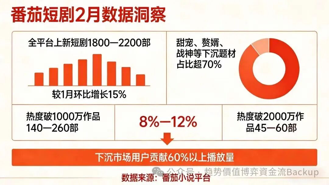 OCR:IMG:番茄短剧2月数据洞察全平台上新短剧1800—2200部甜宠、赘婿、战神等下沉题材占比超70%较1月环比增长15%热度破1000万作品热度破2000万作8%—12%140—260部品45—60部下沉市场用户贡献60%以上播放量趋势价值博弈资金流Backup 数据来源:番茄小说平台