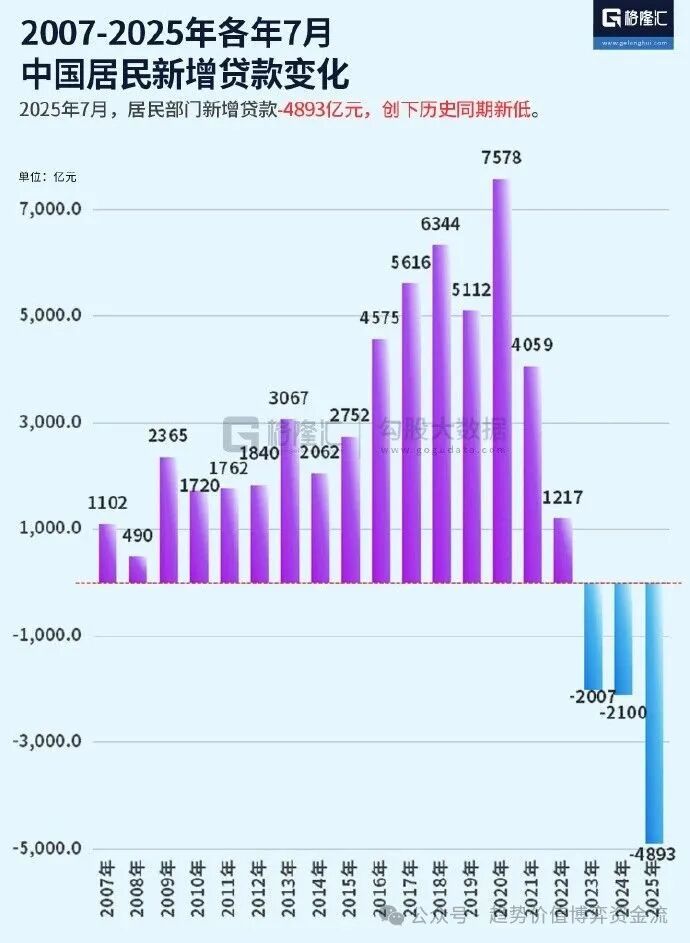 OCR:IMG:G格隆汇2007-2025年各年7月中国居民新增贷款变化2025年7月,居民部门新增贷款-4893亿元,创下历史同期新低。7578单位:亿元76344561651125,045754059306727523,000.023651840206217621720110212171,00490-1,000.0-2007-2100-3,0-5,000.0-4893年年年年年年年年年年年年年年年年年年2025020520082000922220145217118119922022222123224201危势价值博博奔资金流201