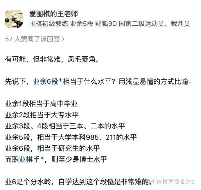 OCR:IMG:爱围棋的王老师围棋初级教练业余5段野狐9d国家二级运动员、裁判员57人赞同了该回答有可能,但非常难,凤毛菱角。先说下,业余6段+相当于什么水平?用浅显易懂的方式比喻:业余1段相当于高中毕业业余2段相当于大专水平业余3段、4段相当于三本、二本的水平业余5段,相当于大学本科985、211的水平业余6段,相当于研究生的水平而职业棋手,则至少是博士水平业6是个分水岭,自学达到这个段位是非常难的。价值博弈资金流2