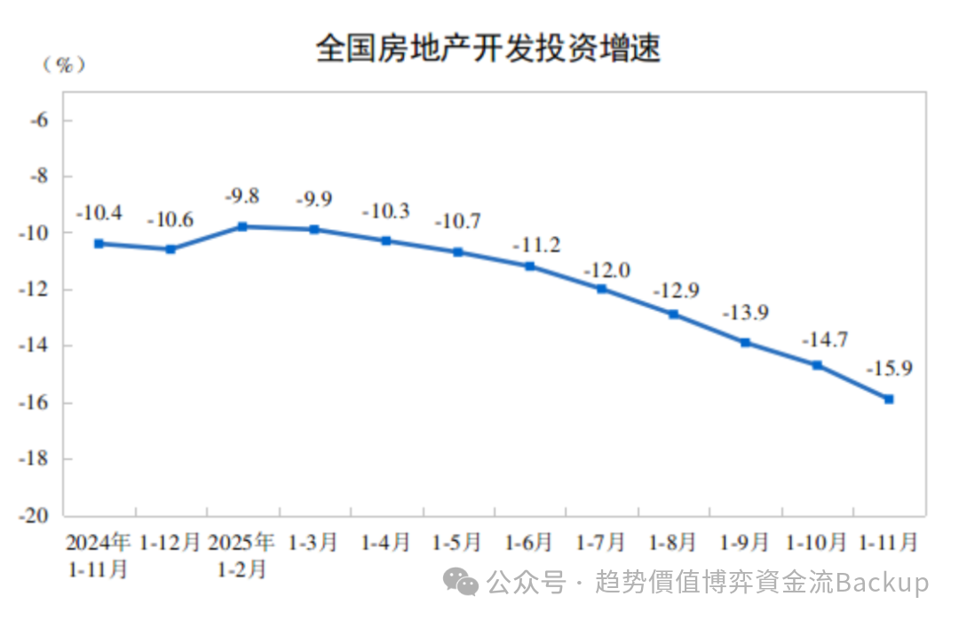 OCR:IMG:全国房地产开发投资增速(%)-6-8-9.8-9.9-10.4-10.6-10.3-10.7-10-11.2-12.0-12-12.9-13.9-14-14.7-15.9-16-18-202024年1-12月2025年1-3月1-4月1-5月1-6月1-7月1-8月1-9月1-10月1-11月1-11月1-2月公众号·趋势价值博弈资金流Backup