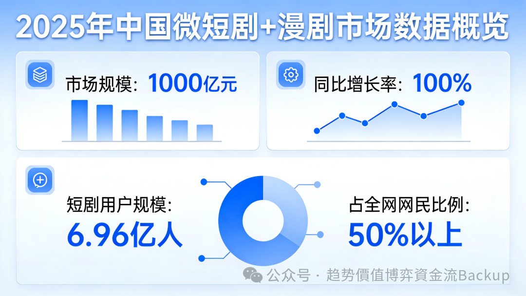 OCR:IMG:2025年中国微短剧+漫剧市场数据概览市场规模:1000亿元同比增长率:100%短剧用户规模:占全网网民比例:6.96亿人50%以上公众号·趋势价值博弈资金流Backup