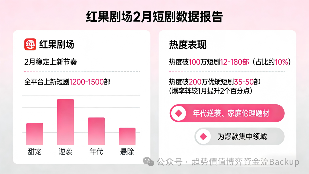 OCR:IMG:红果剧场2月短剧数据报告红果剧场热度表现2月稳定上新节奏热度破100万短剧12-180部(占比约10%)全平台上新短剧1200-1500部热度破200万优频短剧35-50部(爆率较1月提升2个百分点)年代逆袭、家庭伦理题材为爆款集中领域甜宠逆袭年代悬除公众号·趋势价值博弈资金流Backup