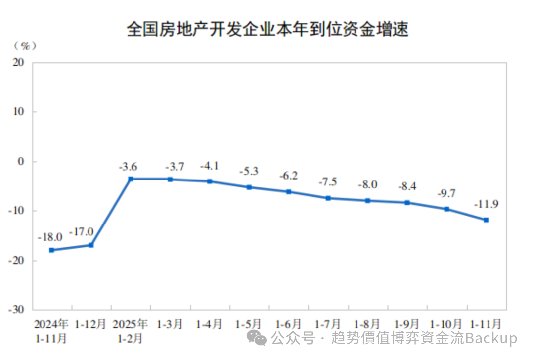 OCR:IMG:全国房地产开发企业本年到位资金增速(%)20100-3.6-3.7-4.1-5.3-6.2-7.5-8.0-8.4-9.7-11.9-10-18.0-17.0-20-302024年1-12月2025年1-3月114月1-5月1-6月1-7月1-8月1-9月1-10月1-11月1-11月1-2月公众号·趋势价值博弈资金流Backup