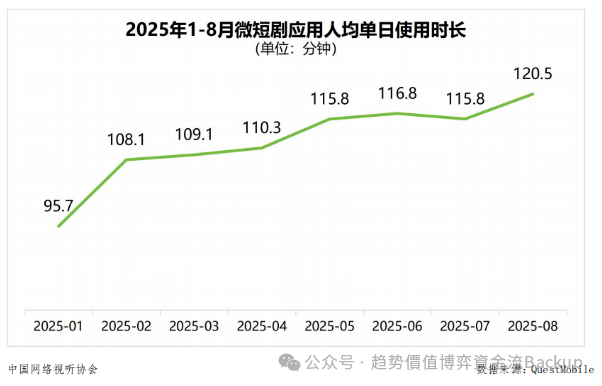 OCR:IMG:2025年1-8月微短剧应用人均单日使用时长(单位:分钟)120.5115.8116.8115.8109.1110.3108.195.72025-012025-022025-032025-042025-052025-062025-072025-08公众号·趋势价值博弈BackkRi.中国网络视听协会