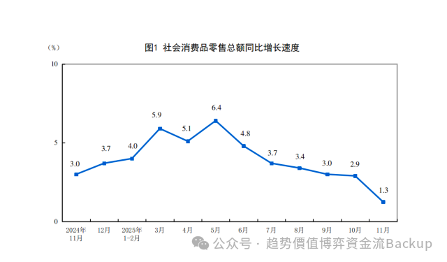 OCR:IMG:(5)图1社会消费品零售总额同比增长速度105.96.45.14.853.74.03.73.43.03.02.91.302024年12月2025年3月4月5月6月7月8月9月10月11月11月1-2月公众号·趋势价值博弈资金流Backup